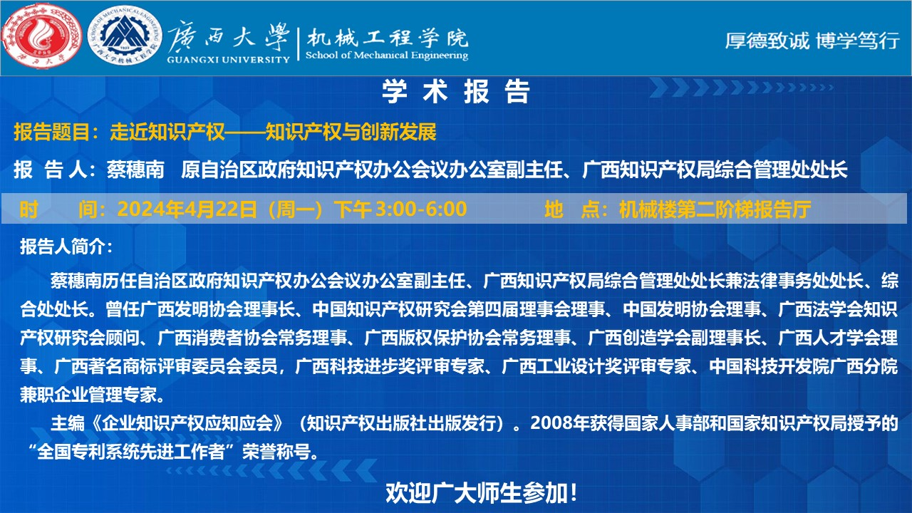 【機(jī)械工程學(xué)院學(xué)術(shù)報(bào)告】走近知識產(chǎn)權(quán)─知識產(chǎn)權(quán)與創(chuàng)新發(fā)展報(bào)