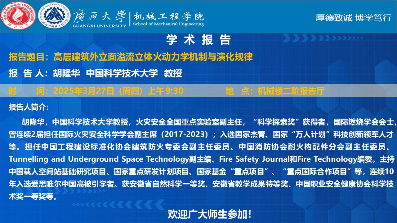 【機(jī)械工程學(xué)院學(xué)術(shù)報(bào)告】高層建筑外立面溢流立體火動(dòng)力學(xué)機(jī)制與演化規(guī)律