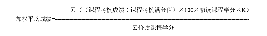 二、學(xué)生須按時完成教學(xué)培養(yǎng)計劃規(guī)定的課程。計算加權(quán)平均成績時,按主修專業(yè)教學(xué)培養(yǎng)計劃所修(含教學(xué)計劃規(guī)定應(yīng)修)各門課程的初修正考成績計算加權(quán)平均成績(保留至小數(shù)點后兩位),統(tǒng)計的時間范圍為入學(xué)至畢業(yè)學(xué)年之前。加權(quán)平均成績的計算公式為: