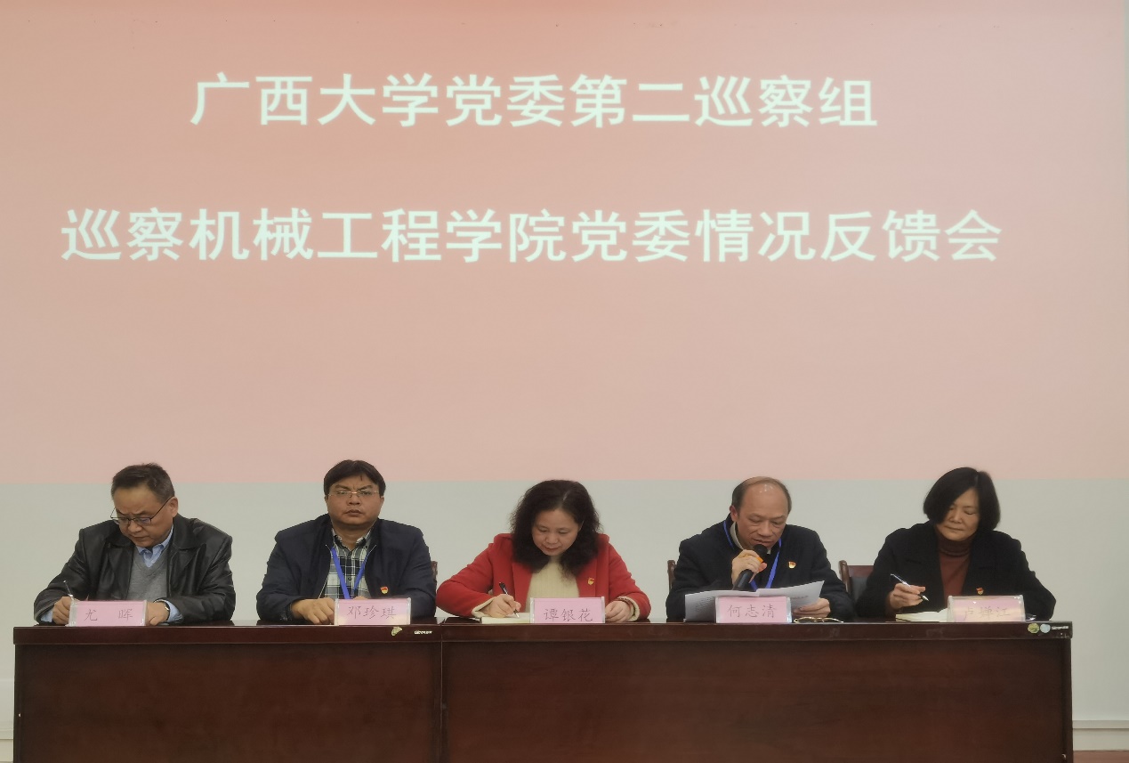 2022年1月4日下午,廣西大學(xué)黨委第二巡察組巡察機(jī)械工程學(xué)院黨委情況反饋會(huì)在機(jī)械樓機(jī)二階會(huì)議室舉行,出席會(huì)議的有校黨委巡察工作領(lǐng)導(dǎo)小組成員代表、審計(jì)處處長譚銀花同志,校黨委第二巡察組長何志清同志,校黨委第二巡察組副組長、計(jì)算機(jī)與電子信息學(xué)院黨委副書記、紀(jì)委書記鄧珍琪同志,機(jī)械工程學(xué)院黨委書記盧嬋江同志,機(jī)械工程學(xué)院院長尤暉同志。參加大會(huì)的有機(jī)械工程學(xué)院全體教師和部分學(xué)生黨員代表。大會(huì)由機(jī)械工程學(xué)院紀(jì)委書記黃路明主持,大會(huì)共進(jìn)行了三項(xiàng)議程。