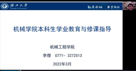 2022年3月6日19時,學院通過騰訊會議(會議號812-461-968)舉辦了本科生學業(yè)發(fā)展指導報告會。報告會由李俚副院長主持,2021級、2020級本科生參加。本次報告會邀請97級校友曹永智作了《制造業(yè)基石-技能人才需求》的專題報告,同時李俚副院長作了《機械工程學院本科生學業(yè)教育與修課指導》的專題報告,最后學院教學辦老師就學生選修課、教務常見問題等進行現場指導。