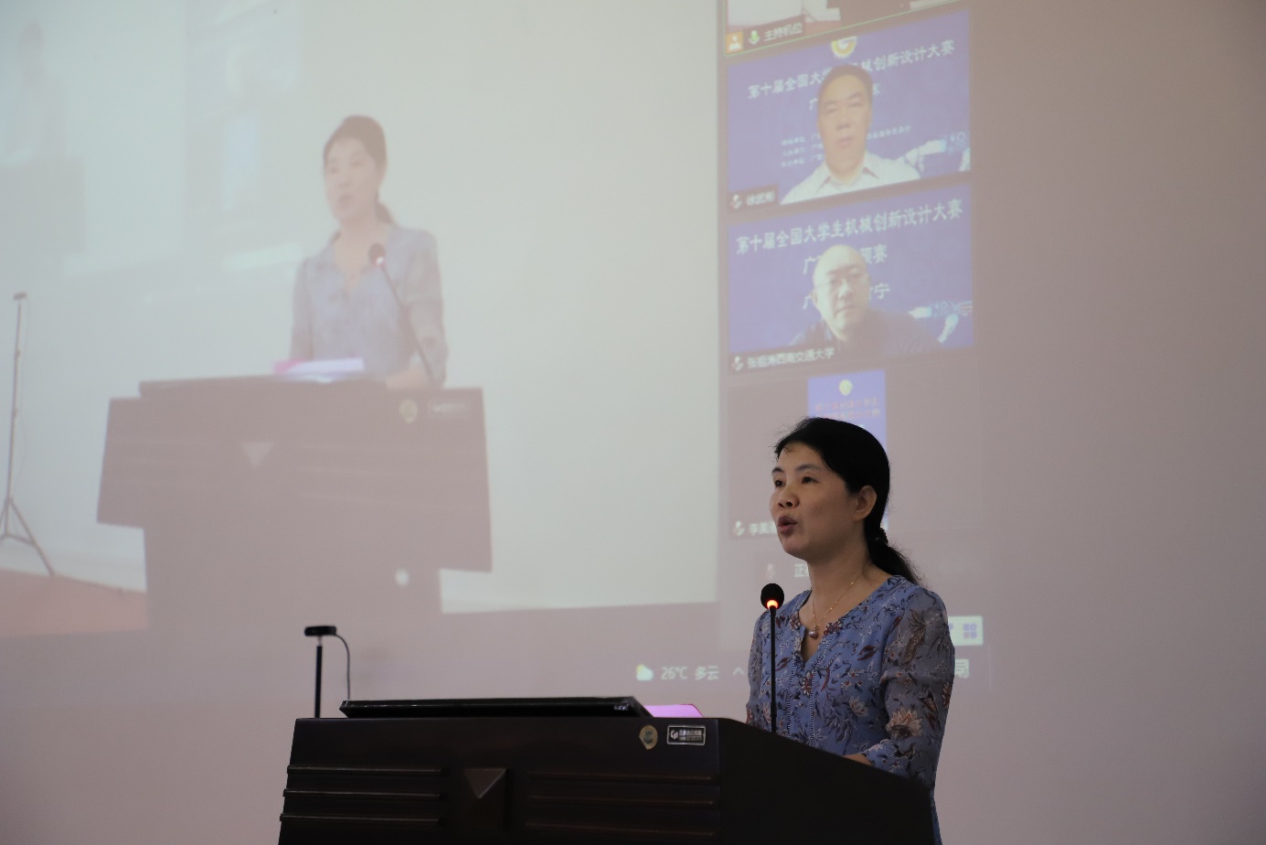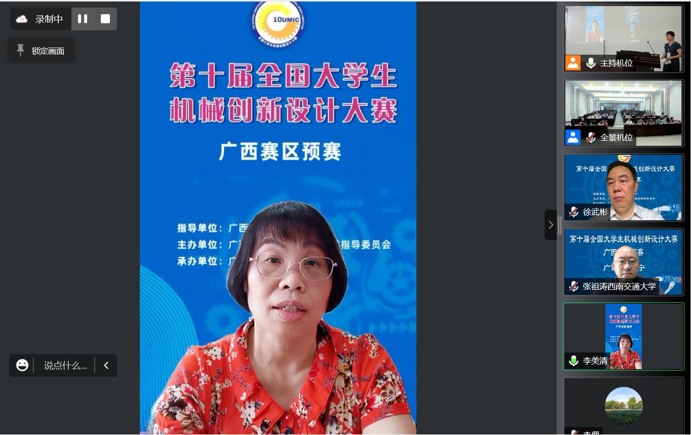 出席開(kāi)幕式的領(lǐng)導(dǎo)和嘉賓有:全國(guó)組委會(huì)委員、廣西賽區(qū)巡視員、西南交通大學(xué)張祖濤教授,廣西賽區(qū)組委會(huì)主任、廣西科技大學(xué)副校長(zhǎng)徐武彬教授,自治區(qū)教育廳高教處李美清處長(zhǎng),廣西大學(xué)教務(wù)處耿葵花處長(zhǎng),廣西大學(xué)機(jī)械工程學(xué)院院長(zhǎng)尤暉教授,本屆評(píng)委會(huì)主任、廣西大學(xué)機(jī)械工程學(xué)院常務(wù)副院長(zhǎng)蒙艷玫教授,評(píng)委會(huì)副主任、桂林電子科技大學(xué)黃美發(fā)教授,廣西高校本科機(jī)械類(lèi)教育指導(dǎo)委員會(huì)秘書(shū)長(zhǎng)尹輝俊教授。出席本次大會(huì)的還有陳遠(yuǎn)玲等21位評(píng)委以及全區(qū)21所高校的老師和學(xué)生代表。受疫情影響,本次大賽還同時(shí)在網(wǎng)絡(luò)上進(jìn)行了云開(kāi)幕,評(píng)審工作全部采用網(wǎng)絡(luò)直播的方式進(jìn)行。開(kāi)幕式由廣西大學(xué)機(jī)械工程學(xué)院副院長(zhǎng)李俚教授主持。 徐武彬副校長(zhǎng)在開(kāi)幕詞中表明了組委會(huì)對(duì)本次比賽的重視,表明了本次大賽的目的在于培養(yǎng)大學(xué)生的創(chuàng)新設(shè)計(jì)意識(shí)、綜合設(shè)計(jì)能力以及團(tuán)隊(duì)協(xié)作精神,加強(qiáng)學(xué)生動(dòng)手能力的培養(yǎng)和工程實(shí)踐的訓(xùn)練,提高學(xué)生針對(duì)實(shí)際需求通過(guò)創(chuàng)新思維,進(jìn)行機(jī)械設(shè)計(jì)和工藝制作等實(shí)際工作能力。隨后,李美清處長(zhǎng)代表廣西教育廳講話(huà),她指出教育廳對(duì)本次大賽的高度重視和大力支持,并對(duì)本次比賽的參賽學(xué)生寄予厚望。耿葵花處長(zhǎng)代表主辦方廣西大學(xué)講話(huà),向全體與賽人員介紹了廣西大學(xué)的基本情況,特別是我校對(duì)全國(guó)大學(xué)生機(jī)械創(chuàng)新設(shè)計(jì)大賽的重視。張祖濤教授在講話(huà)中對(duì)廣西區(qū)賽事舉辦的規(guī)格和規(guī)范性表示肯定。最后,蒙艷玫教授宣讀了大賽評(píng)審規(guī)則,黃美發(fā)教授代表評(píng)審員宣誓,廣西大學(xué)韋博文同學(xué)代表參賽學(xué)生進(jìn)行了發(fā)言。
