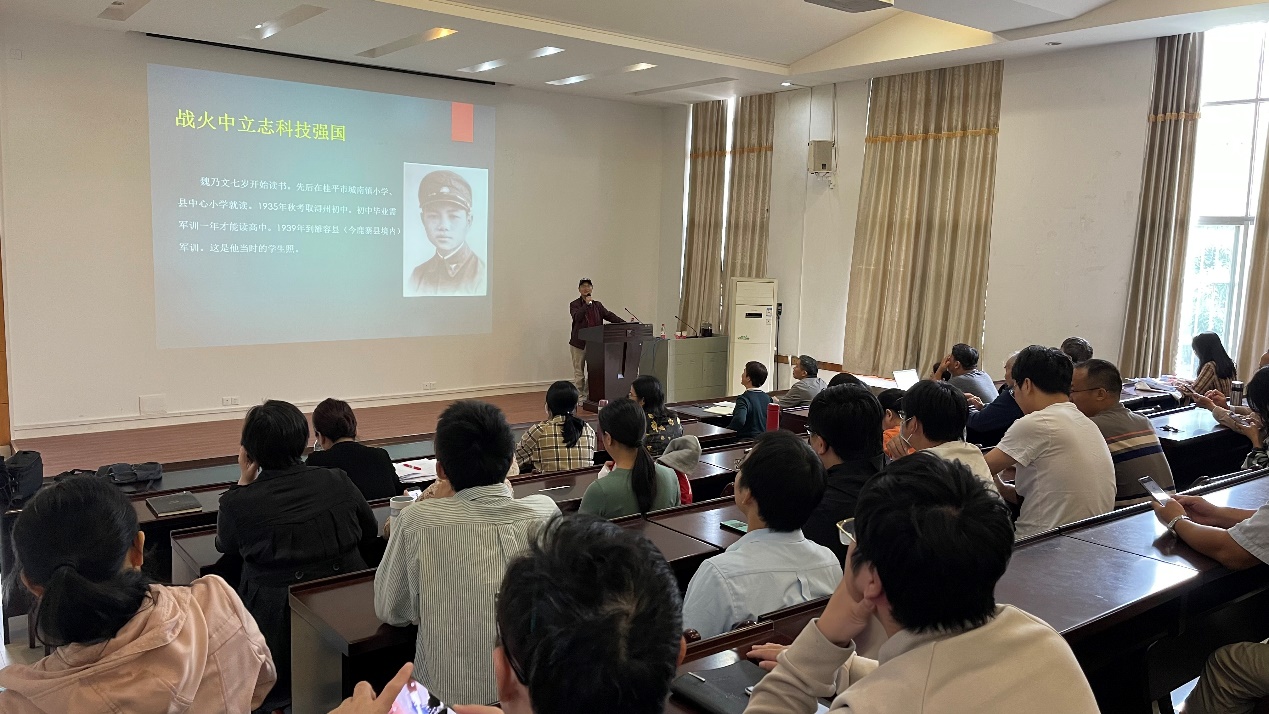 2022年11月15日下午,學(xué)院召開了全院教職工課程思政教育大會暨清廉故事會。此次特別邀請我院杰出校友、國家“兩彈一星”研究專家魏乃文老先生的侄子——魏風(fēng)先生,為全院教師職工上了一堂以追憶魏乃文老先生生平事跡、學(xué)習(xí)魏老家國情懷為主題的思政教育課。