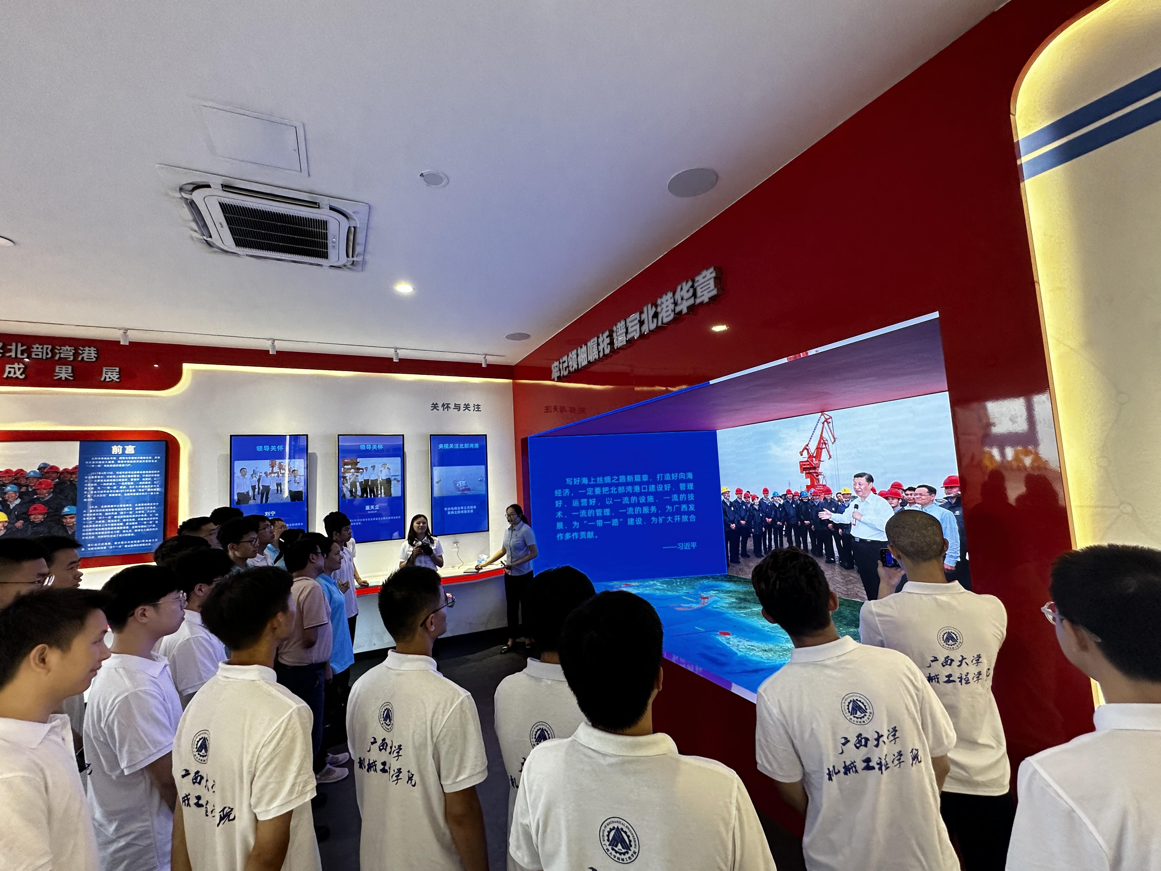 在欽州自動(dòng)化集裝箱碼頭,工作人員通過(guò)巨型沙盤(pán)、宣傳短片和現(xiàn)場(chǎng)講解,從無(wú)人小車(chē)到大型自動(dòng)化岸橋,從信息系統(tǒng)操控到智能機(jī)械維護(hù),讓我們直觀、全面地了解了我們的第四代碼頭的科技含量和智慧水平;在漢代文化博物館,波斯陶壺、羅馬玻璃碗、瑪瑙串珠……這些來(lái)自東南亞、西亞、地中海三問(wèn)文物,見(jiàn)證了中國(guó)古代“海上絲綢之路”的繁榮景象,讓師生們了解到了這里曾經(jīng)是我國(guó)最早連接?xùn)|南亞、南亞、西亞的重要口岸;在北海鐵山港,實(shí)踐團(tuán)實(shí)地參觀了港口的貨物運(yùn)輸組織、裝卸作業(yè)過(guò)程、設(shè)備狀況等運(yùn)作流程,感受到了港口繁忙的作業(yè)場(chǎng)景,既增長(zhǎng)了見(jiàn)識(shí),又了解了港口青年的工作狀態(tài);在玉林博白的龍?zhí)豆I(yè)園,實(shí)踐團(tuán)參觀了華創(chuàng)新材銅箔有限公司、廣西華友鈷業(yè)有限公司,參觀了新材料生產(chǎn)流水線、基地員工綜合中心等,對(duì)新材料、新能源產(chǎn)業(yè)的發(fā)展以及新興產(chǎn)業(yè)員工的生活狀態(tài)有了更加直觀的了解。這些現(xiàn)場(chǎng)參觀,讓實(shí)踐團(tuán)成員更加直觀形象地了解了廣西地方產(chǎn)業(yè)的發(fā)展取得的巨大成就,感受到了既有歷史文化底蘊(yùn)、又有現(xiàn)代化創(chuàng)新氛圍的廣西呈現(xiàn)出的蓬勃之勢(shì)。實(shí)踐團(tuán)還在參觀期間與參訪單位的校友代表開(kāi)展了座談交流;同時(shí),注重發(fā)揮優(yōu)勢(shì),與企業(yè)員工一起開(kāi)展理論宣講和學(xué)習(xí),團(tuán)中央青年講師團(tuán)講師、廣西青年講師團(tuán)金牌講師、學(xué)院團(tuán)委書(shū)記程銳同志以“使命”為主題宣講了黨的二十大精神和團(tuán)的十九大精神;此外,實(shí)踐團(tuán)還利用參觀間隙開(kāi)展了集中研討。