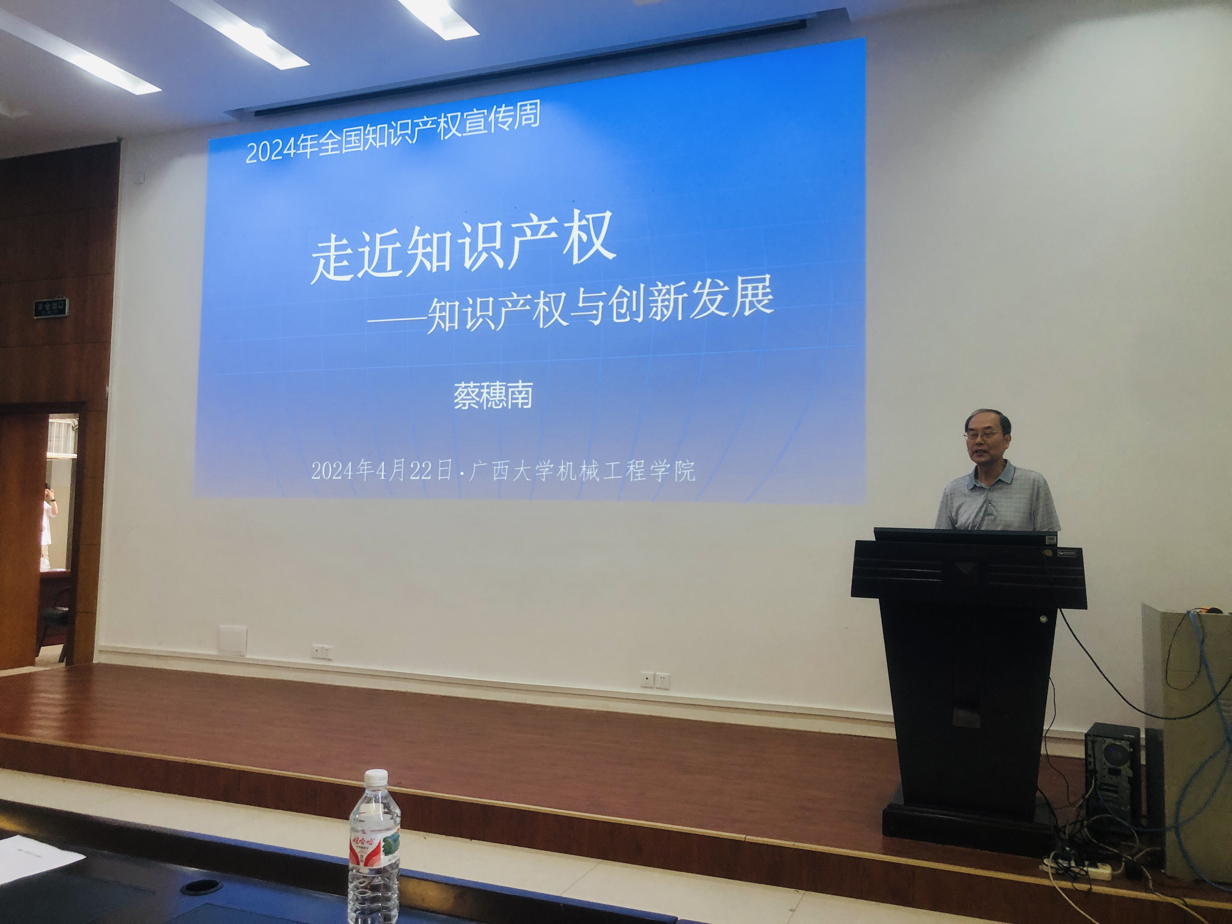 4月22-26日是我國第十六個全國知識產(chǎn)權(quán)宣傳周,也是世界知識產(chǎn)權(quán)日。為深入貫徹落實黨中央、國務(wù)院關(guān)于大力推進專利產(chǎn)業(yè)化的決策部署,加速我院高價值專利的轉(zhuǎn)化,推動我院與企業(yè)和科研機構(gòu)的專利轉(zhuǎn)化,我院于4月26日邀請原自治區(qū)政府知識產(chǎn)權(quán)辦公室副主任、廣西知識產(chǎn)權(quán)局綜合管理處處長蔡穂南給學(xué)院師生作“走近知識產(chǎn)權(quán)——知識產(chǎn)權(quán)與創(chuàng)新發(fā)展”報告。