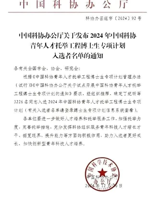 據(jù)悉,中國科協(xié)青年人才托舉工程博士生專項計劃于2024年首次試點設(shè)立,旨在讓學術(shù)資源更廣泛地惠及有發(fā)展?jié)摿Φ那嗄昕萍己髠滠?,?0周歲以下高年級在讀博士研究生為支持對象,依托全國學會、協(xié)會、研究會進行托舉培養(yǎng),為入選者提供組織吸納、學術(shù)兼職和學術(shù)資助等托舉服務(wù),助力優(yōu)秀博士研究生更好成長,加快創(chuàng)新型青年科技人才培養(yǎng),充分發(fā)揮科協(xié)組織服務(wù)青年科技人才增長才干、拓寬眼界、提升能力等方面的積極作用,通過組織吸納、安排學術(shù)兼職、支持學術(shù)論文發(fā)表、提供學術(shù)交流平臺、資助開展出國(境)訪學等方式,助力優(yōu)秀博士研究生更好成長。