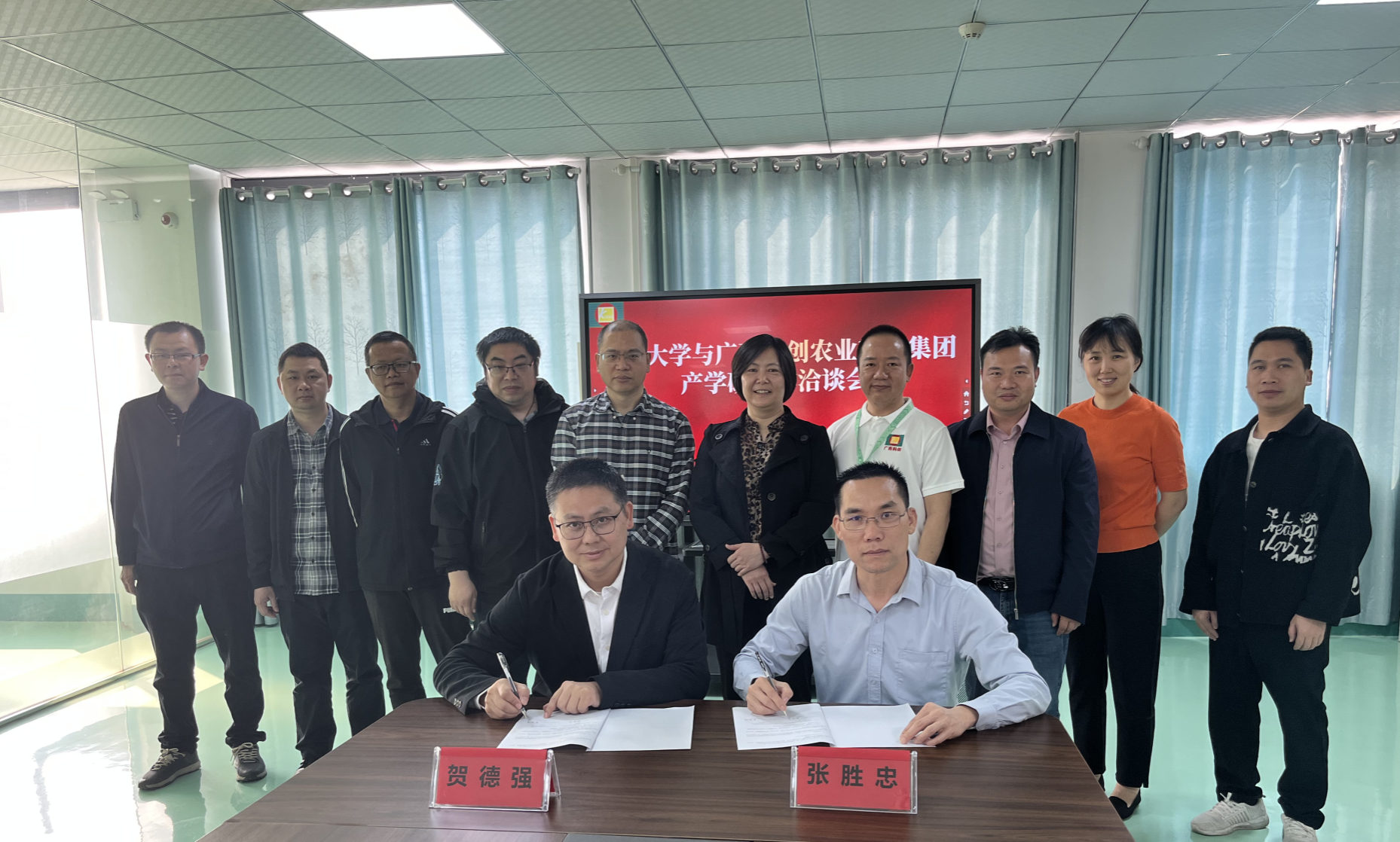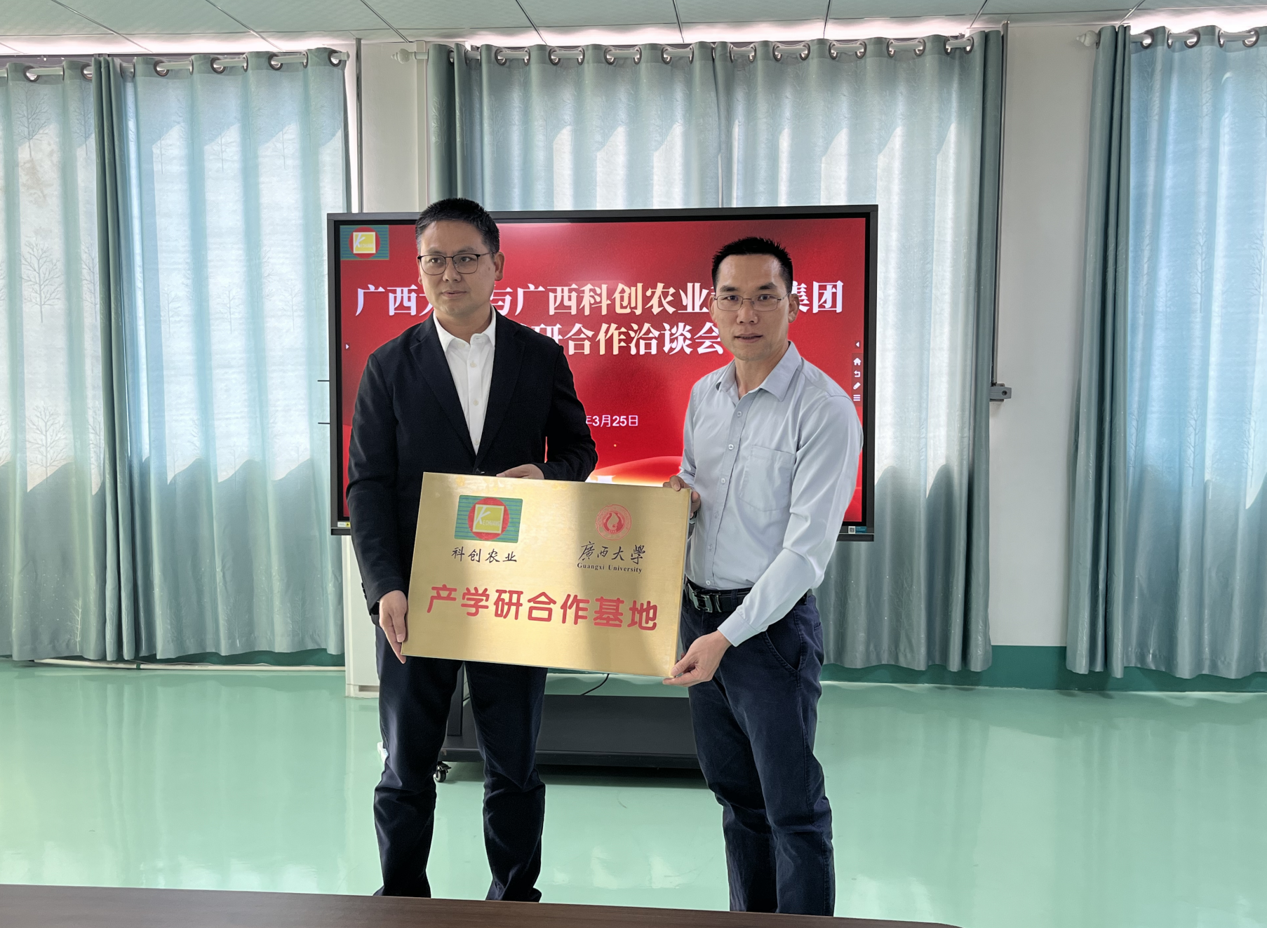 最后,賀德強院長代表西大和張勝忠董事長簽署“廣西大學(xué)-廣西科創(chuàng)農(nóng)業(yè)科技集團產(chǎn)學(xué)研合作基地”共建協(xié)議,并現(xiàn)場舉行揭牌儀式。
