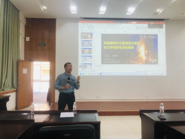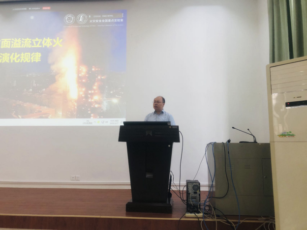 高層建筑外立面立體火災(zāi)是城市火災(zāi)與公共安全的重要挑戰(zhàn)。胡教授從室內(nèi)火災(zāi)行為、外立面火溢流臨界理論、火溢流特征參數(shù)演化和城市大尺度高層建筑立體火等四個(gè)層面,對(duì)環(huán)境風(fēng)作用下高層建筑火災(zāi)燃燒行為進(jìn)行了系統(tǒng)介紹,為師生講解了環(huán)境風(fēng)、低壓、不同外墻結(jié)構(gòu)等邊界條件下的開口火溢流及外立面立體火行為,揭示了外立面火溢流發(fā)生機(jī)制、火焰高度、溫度、熱流分布等參數(shù)的數(shù)理模型及城市大尺度災(zāi)害演化機(jī)理。