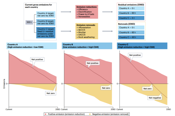 在第二個政策設(shè)計中,凈零政策中納入了固定的源頭減碳目標(與CDR分開),此時并行部署的CDR僅作為補充而非取代脫碳。根據(jù)這一設(shè)計,一個國家可以自由選擇高或低CDR路徑,只要部署的CDR足以實現(xiàn)凈零目標即可。盡管國家A和國家C均在2060年達到相同的剩余排放水平,但國家C通過積極的CDR部署,能夠更早地實現(xiàn)凈零排放并過渡到凈負排放。因此,CDR既可以推遲減排速度,延長超調(diào)時間,也可以與快速脫碳相結(jié)合,作為加速實現(xiàn)凈零和凈負排放、縮短溫度超調(diào)期的關(guān)鍵工具。