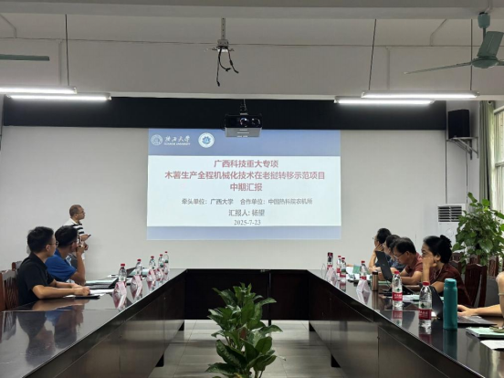 7月23日,廣西科技情報(bào)學(xué)會(huì)組織專(zhuān)家組對(duì)我院楊望教授主持的廣西科技重大專(zhuān)項(xiàng)項(xiàng)目“木薯生產(chǎn)全程機(jī)械化技術(shù)在老撾轉(zhuǎn)移示范”進(jìn)行中期檢查和現(xiàn)場(chǎng)查定。專(zhuān)家組由廣西農(nóng)業(yè)職業(yè)技術(shù)大學(xué)二級(jí)教授黃衛(wèi)萍、廣西農(nóng)機(jī)研究院有限公司正高級(jí)工程師莫建霖、廣西農(nóng)機(jī)鑒定站高級(jí)工程師盧一福等組成。項(xiàng)目負(fù)責(zé)人楊望教授、項(xiàng)目合作單位中國(guó)熱科院農(nóng)機(jī)所課題負(fù)責(zé)人崔振德副研究員,以及項(xiàng)目組主要骨干成員共7人參加會(huì)議。