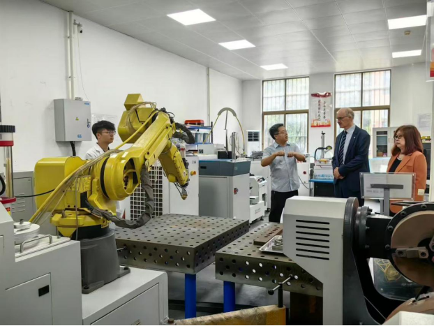 在智慧車間,馮建強老師向來賓詳細(xì)介紹柔性制造系統(tǒng)、五軸數(shù)控加工中心以及我院自主研發(fā)的智能分揀機器人等智慧加工設(shè)備的運轉(zhuǎn)和實施工程訓(xùn)練的情況。大衛(wèi)?菲茨帕特里克校長認(rèn)真聆聽,頻繁提問,并對我院為大學(xué)生提供優(yōu)越的動手實踐能力培養(yǎng)條件表示高度贊許。