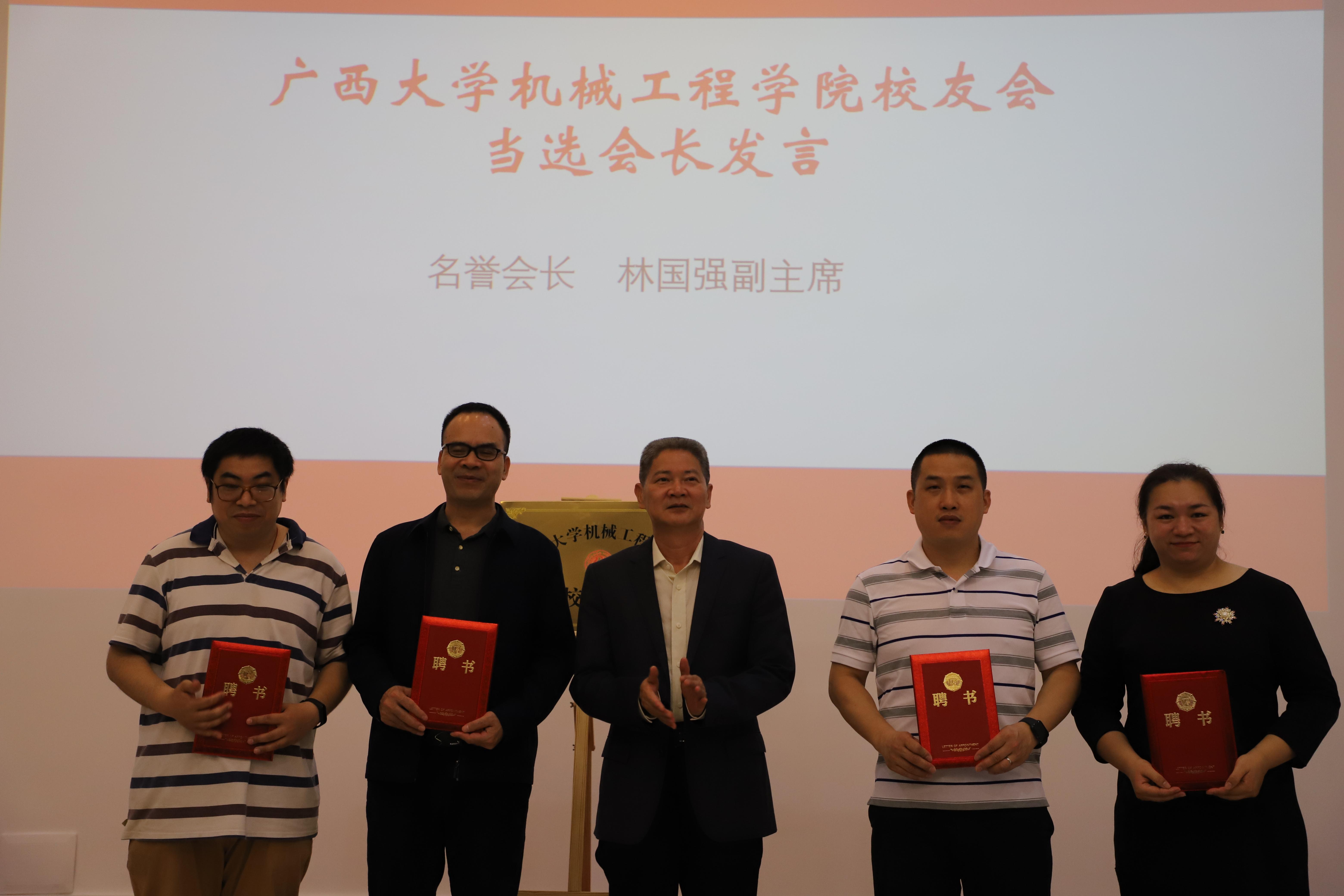 成立大會上,與會代表表決通過了《廣西大學(xué)機(jī)械工程學(xué)院校友會籌備工作報(bào)告》、《廣西大學(xué)機(jī)械工程學(xué)院校友會章程草案》和第一屆理事會建議名單。林國強(qiáng)副主席擔(dān)任校友會榮譽(yù)會長,毛漢領(lǐng)教授擔(dān)任會長,學(xué)院原黨委書記黃德平擔(dān)任執(zhí)行會長,黃健、丁潤生、盧嬋江、尤暉、陳聚等擔(dān)任常務(wù)副會長。林國強(qiáng)主席和馬少健副校長共同為學(xué)院校友會揭牌。林國強(qiáng)副主席作為當(dāng)選會長發(fā)言,他表示自己作為校友見證校友會成立感到十分榮幸,希望校友會能為機(jī)械工程學(xué)院的發(fā)展出一份力。馬少健副校長代表學(xué)校對各位校友的到來表示熱烈的歡迎,歡迎他們回??纯矗煌瑫r(shí)也對機(jī)械工程學(xué)院校友會的成立表示熱烈的祝賀。機(jī)械工程學(xué)院院長尤暉和錦豐科技(深圳)有限公司總經(jīng)理曹永智分別代表學(xué)院和校友上臺發(fā)言。