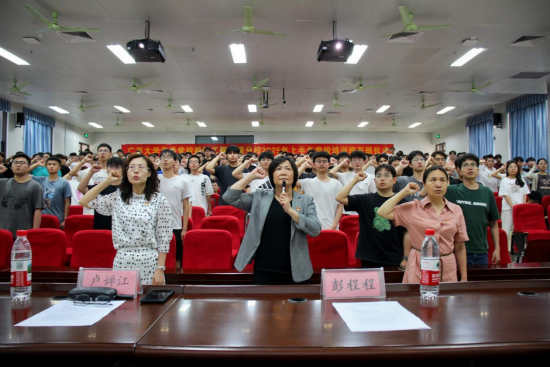 最后,全體人員共同高唱《國際歌》。預(yù)備黨員在盧嬋江的帶領(lǐng)下進(jìn)行入黨宣誓,結(jié)束本次開班儀式。
