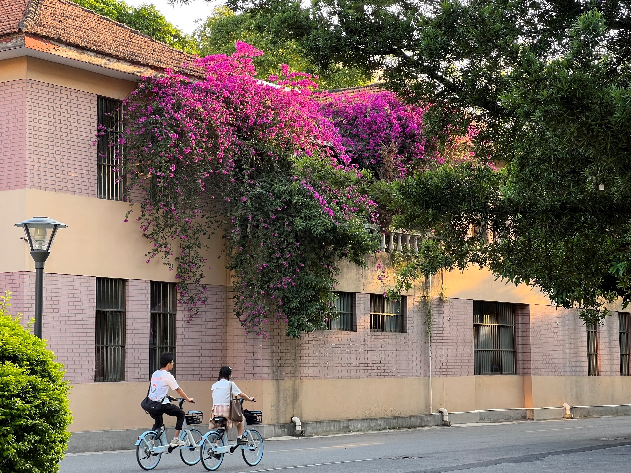 作品介紹:拍攝于2022年5月3日下午約18點(diǎn)20,開車路過機(jī)械學(xué)院的紅樓,紅樓二樓的三角梅正盛,夕陽下三兩路過的學(xué)生,相得益彰。